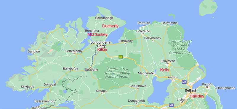 The map below (currently) only shows the origins of Kilkie, Docherty, Halliday, Kelly and McCloskey.