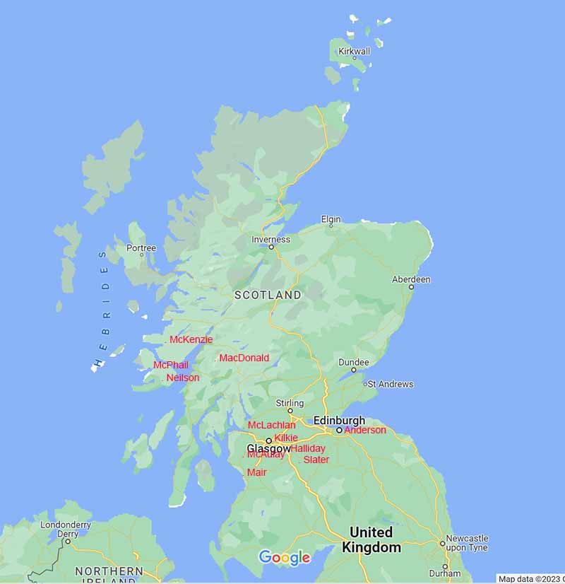The map below shows the main locations as an origin for family name groups. Of course many family members with names shown were not from the location given as familes moved around and most familes ended up in Glasgow.
